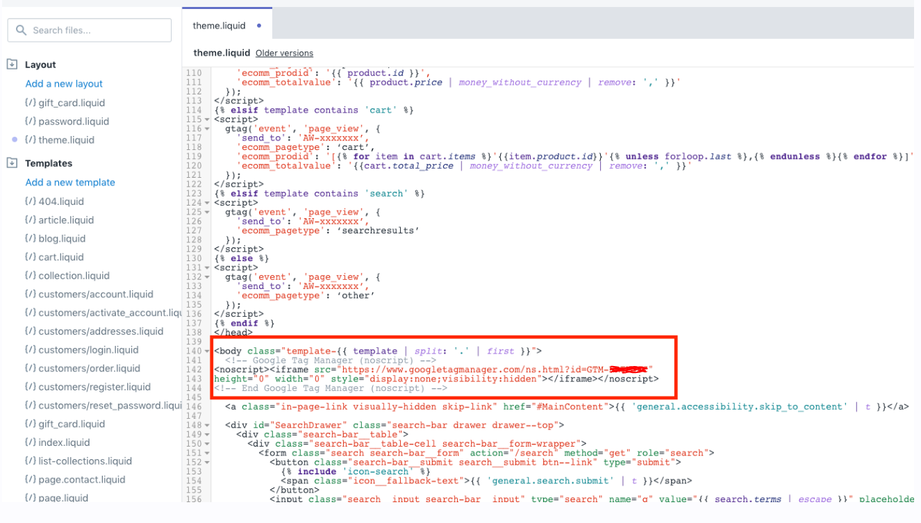 Next you need to add the second (body) code snippet just after the opening <body> tag in your theme.liquid code.
